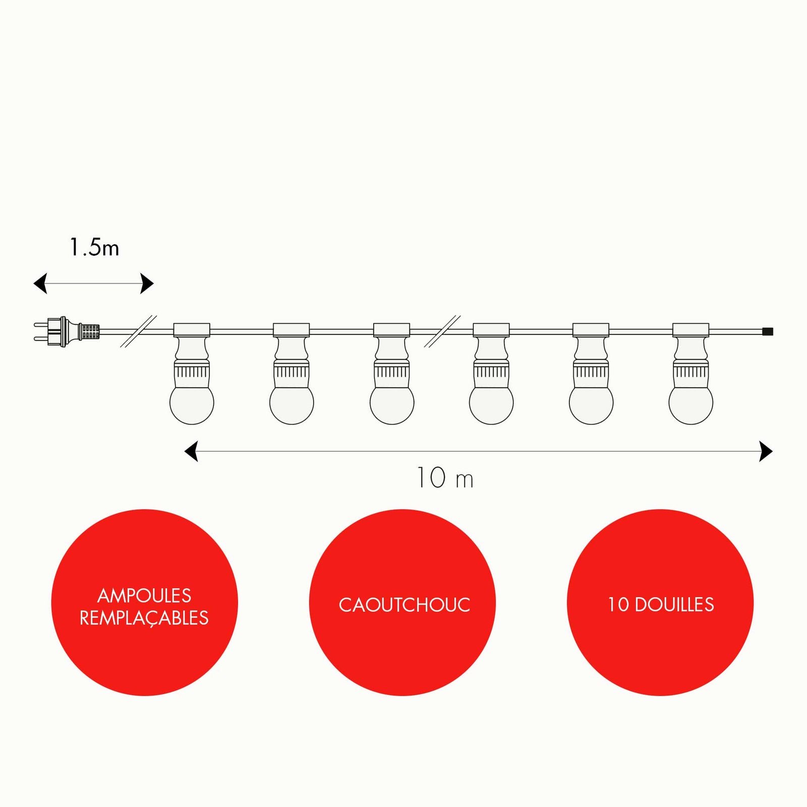 Ce pack comprend une guirlande guinguette de 10 mètres et 10 ampoules blanc chaud. Les ampoules B22 sont interchangeables et remplaçables.