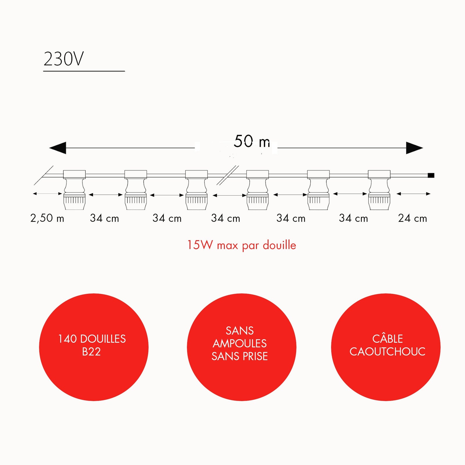 Ce pack comprend une guirlande guinguette de 50m, et 140 douille B22. Les ampoules ne sont pas inclues.