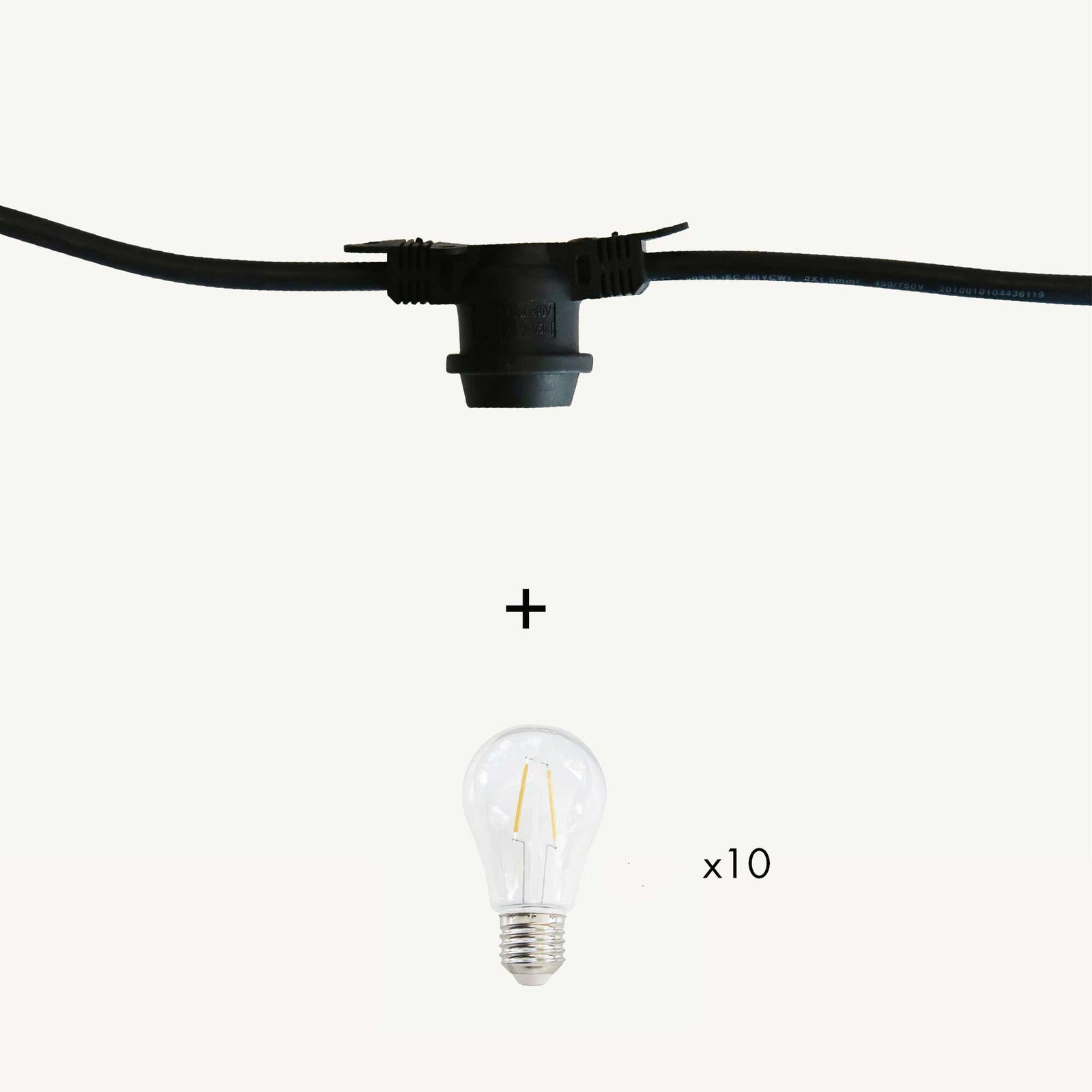Ce kit est composé de la guirlande guinguette Festival 551071 et de 2 lots d'ampoules 551078 soit 10 Blanc chaud à filaments douille E27 forme A60. C'est à vous d'assembler les ampoules. Sa puissance est de 20W. La guirlande mesure 5m, elle est prolongeable jusqu'à 100m. Elle est vendue avec des ampoules. Son câble est noir. Chaque douille est équipée d'un joint d'étanchéité et supporte 15W.